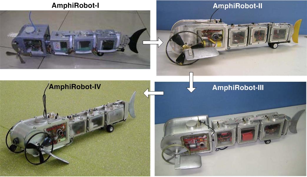 1.提出了一种以仿鱼游动和仿轮式运动为水下、陆地主要驱动方式,以爬行和仿海豚运动为辅助运动形式的多模态两栖机器人方案,设计了胸鳍复合驱动机构。试制了四代具有模块化结构的机器人样机,取得了良好的运动效果。
