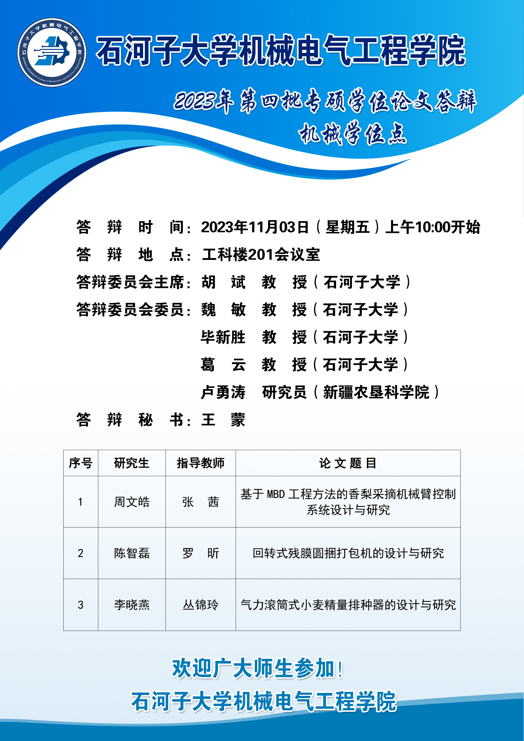 1.春满四合院 2023年第四批研究生学位论文答辩安排表春满四合院 2023年第四批次学位论文答辩安排表.xlsx2.春满四合院 2023年第四批研究生学位论文答辩海报春满四合院 机械工程博士海报.jpg春满四合院 机械专硕海报.jpg春满四合院 农业工程博士海报.jpg