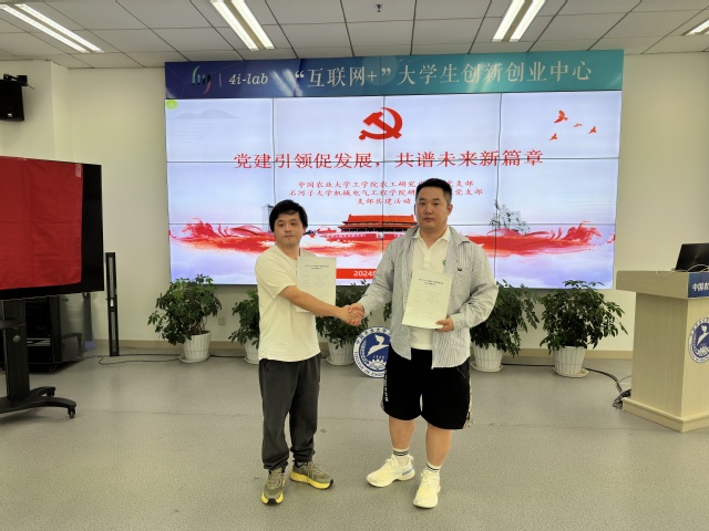 中国农业大学工春满四合院 农业工程研究生第四党支部组织委员孙鹏耕、研究生第五党支部书记李英杰分别介绍了双方党支部党建工作开展情况,对组织共建的主要内容和保障措施进行了交流。随后双方在现场签订党建共建协议。